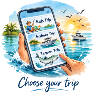 Pick the trip that fits your group – from quick kids trips to flexible inshore charters or seasonal tarpon for anglers chasing a tropy experience.